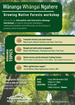 Ngāti Tamaterā, in partnership with the New Zealand Forest Service (Te Uru Rākau – MPI), warmly invites you to join us for the Wānanga Whāngai Ngahere – Growing Native Forests Workshop, a kaupapa that brings together our collective knowledge and expertise in caring for and restoring our native forests across Hauraki.